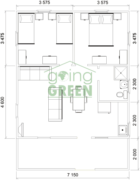 2 Bedroom Units House dimensions: 7.158m width x 8.230m length (Floor space: 58.91m2) Veranda dimensions: 7.158m width x 2.00m length (Floor space: 14.32m2) Total under roof area: 73.23m2